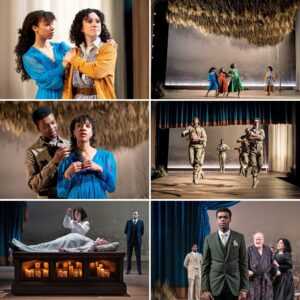 The members of the King’s court and military are characterized admirably by Patrick Agada, William Dick, Casey Hoekstra, Joseph Aaron Johnson, Jeff Kurysz, and Pablo David. On Helen’s arrival in Italy, she encounters three ladies (delightfully depicted by Christiana Clark, Emma Ladji, and Tanya Thai McBride) who become involved. In amongst all the adventures are the two comic reliefs – Mark Bedard playing Parolles, a clotheshorse coward who shows his true colors, and the always A-1 amusing Elizabeth Ledo as the requisite fool, Lavatch. Also in the mix are passages of well motivated movement, designed by Stephanie Martinez, which add to the motion and emotion of the play.