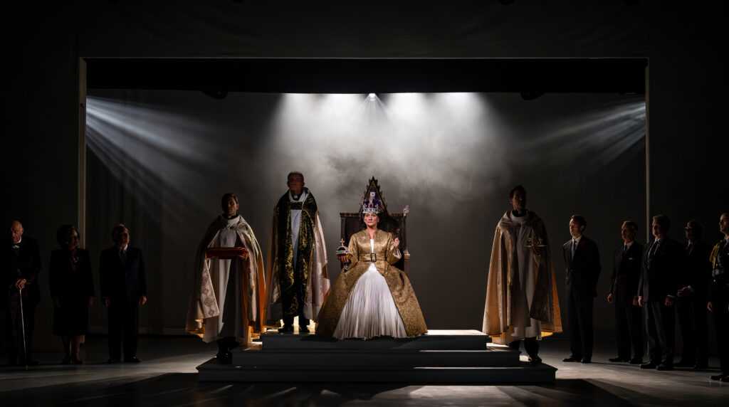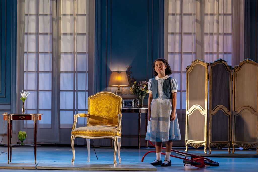 The lovely Susie McMonagle as Margaret Thatcher is wonderful. Only onstage for a short time in the second act, she is completely memorable and spot on. Ron E. Rains plays Harold Wilson, the queen’s favorite Prime Minister; his poignant and masterful characterization of a gentleman eventually facing Alzheimer’s disease is riveting, honest, and moving. The entire cast including ensemble members are simply marvelous. Two very talented young ladies, Elin Joy Seiler and Omi Lichtenstein, portray young Elizabeth with grace beyond their years.