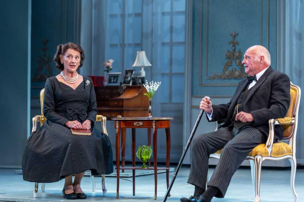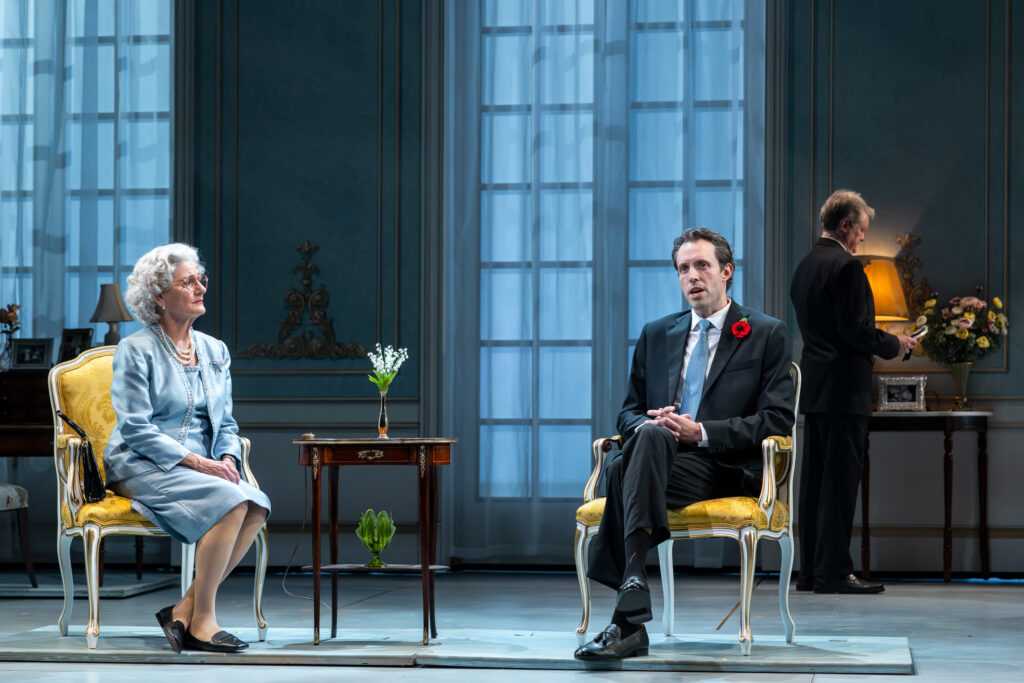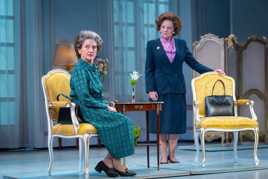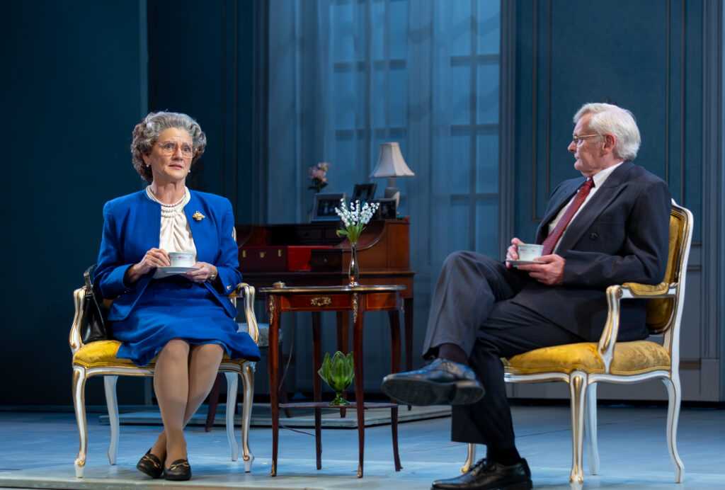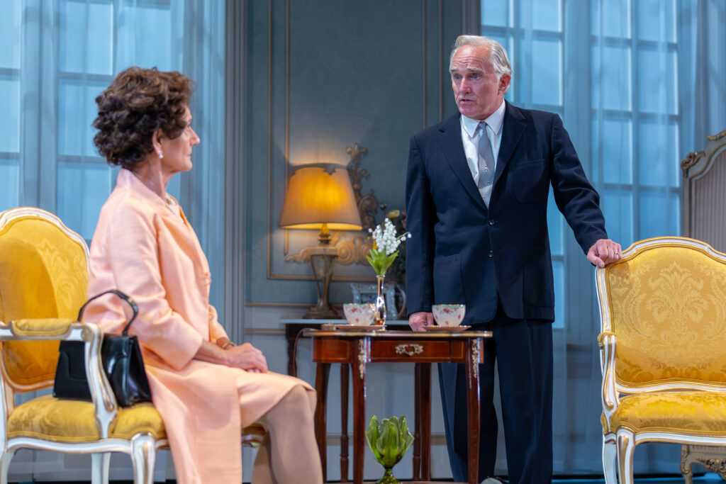 Drury Lane Theatre’s stellar production of “The Audience” is wholly fabulous. The set is elegant and charming, very realistic, with believable and well-placed props. An attractive on-stage screen facilitates some of the transformational costume changes by Her Majesty. Wigs are often switched to depict various eras, and there is never a hair out of place; the costumes and accessories are most lovely. My favorite ensembles are a glamorous white ball gown and glimmering tiara, as well as a black cocktail dress with a netted petticoat, and a stunning pink suit. Lighting design is exceptional, understated and illuminating.