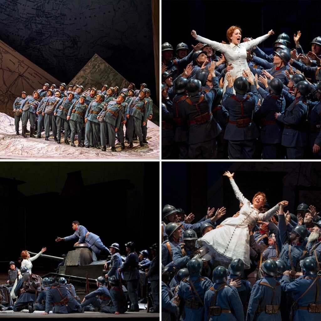 Conductor Speranza Scappucci leads a buoyant account of the score that captures the character of the piece, balancing humor with energy, as does Christian Räth’s directorship. Chantal Thomas’ set design features a larger-than-life military map motif across the stage for the first act, and the castle design for the second act of a paneled angled drawing room is most effective. Karine Girard’s choreography, from the battlefield to the ballroom, makes creative use of the male chorus in their synchronized movements.