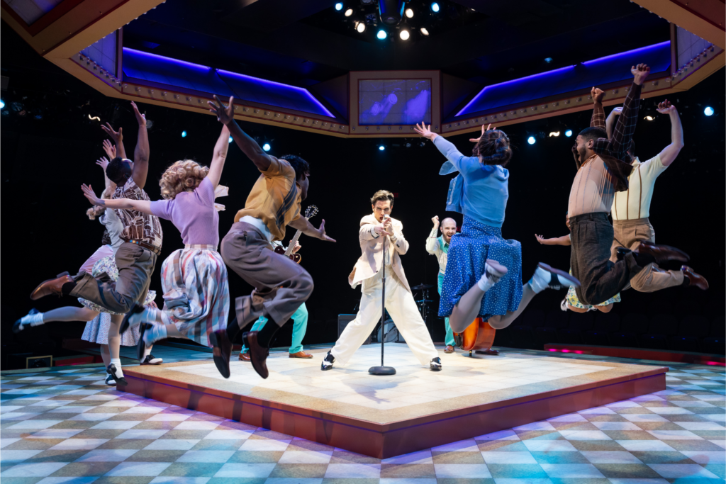 The entire cast is stellar; in the role of adult Elvis is the enormously talented Tyler Hanes – his characterization of the King of Rock and Roll is flawless. He embodies Elvis right down to simple mannerisms and movements, without straying into stereotype. Elizabeth Telford brings his mom to life with sincerity and realism. As father Vernon Presley, Karl Hamilton has excellent comic timing and is very believable. Jackson Evans is Sam Phillips, head of Sun Records – he plays his role perfectly, humorous and gritty, with razor sharp big line delivery. Rob Lindley never overplays the infamous Colonel Tom Parker – he is most credible.