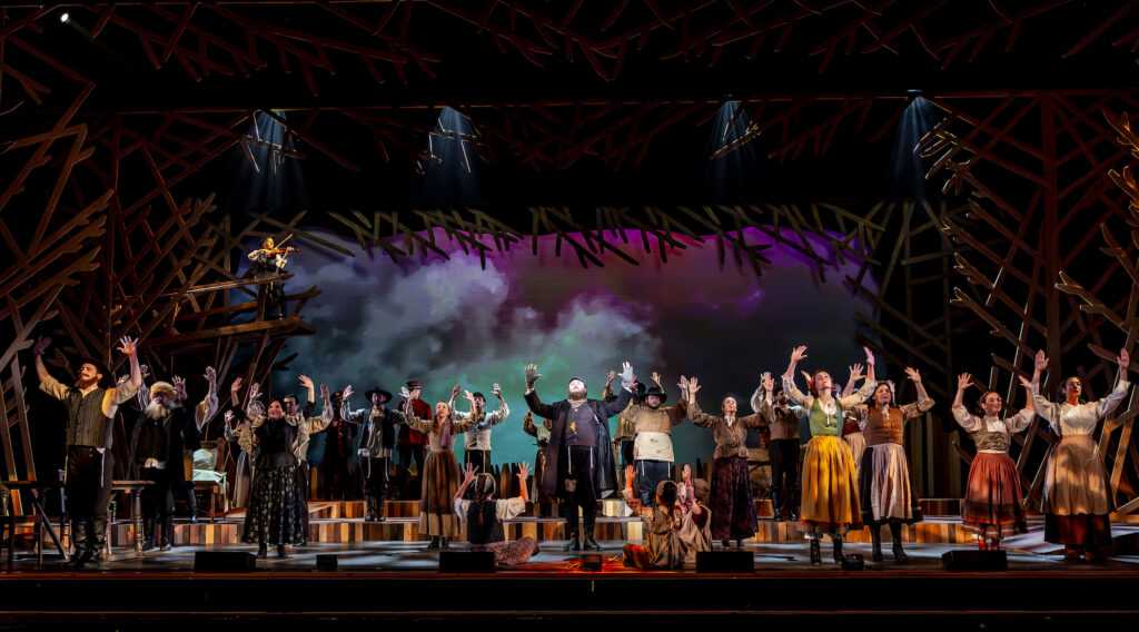 Sam Nachison (Tevye) is outstanding in his voice and commanding stature with his “Tradition” yet soft loving heart; Mitzi Smith as his other half Golde is powerful. The daughters, Madison Liphoff (Tzeitel), Elissa Newcorn (Hodel), and Madison Jaffe-Richter (Chana), as well as twin sisters Aubrey (Shprintze) & Adeline (Bielke) Rosenthal, are brilliant. Sara Stern (Yente) is funny and enthralling; Nathan Kabara (Motle), Jacob Simon (Perchik), and Jake Mickel (Fyedka) each remarkable in their respective roles.