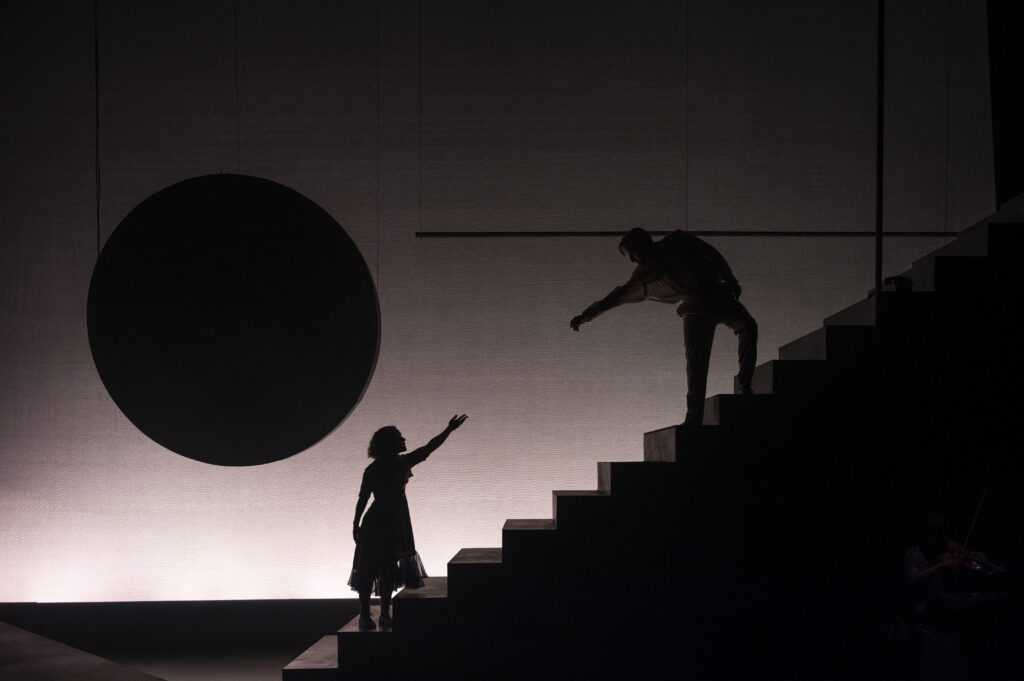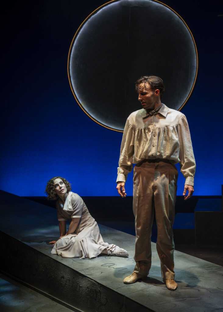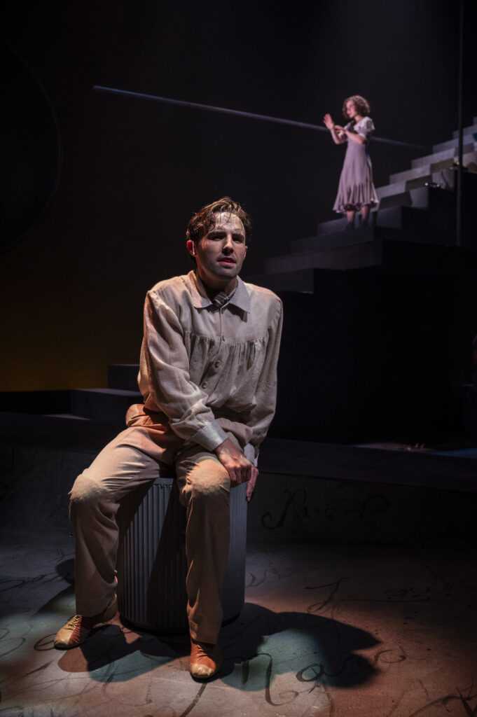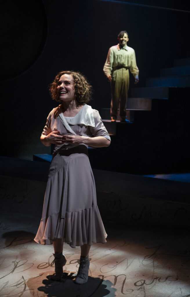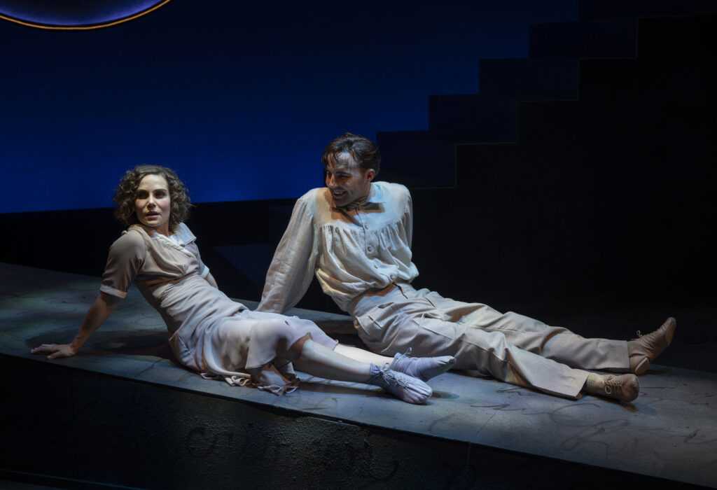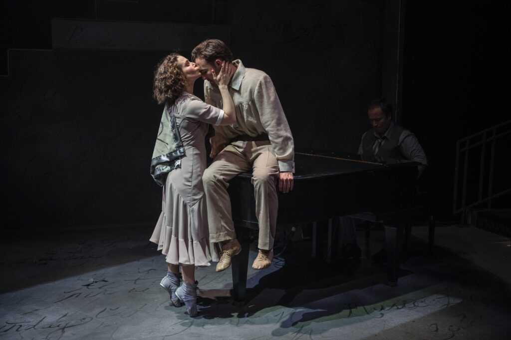 The stark set uses dramatic lighting to add to this bittersweet biography. A ramp and staircase set the stage, with deep red hues, Hebrew characters, and warm lamplight type glow all envelope the story with illumination. Simple props have rather symbolic meaning, a fish pillow and telephone helping advance the narrative. The music, dance, and stage movement are most organic, and very beautifully executed – the action on the piano is also well played. Maestro musical director Michael Mahler doubles as one of the two excellent instrumentalist/ensemble players, the other being the wonderful Elisa Carlson.
