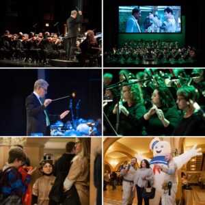 When you want great entertainment and an ectoplasmic good time, “who ya’ gonna’ call?” For Chitown audiences, the fabulous Chicago Philharmonic sure got the job done with “Ghostbusters Live in Concert”, a one-night theatrical extravaganza at the beautiful Auditorium Theatre. A pre-show reception with in-costume Ghostbusters handing out a variety of complimentary candy treats, and photo ops with “Slimer” and “Stay Puft Marshmallow Man” in the lobby, gave the enthusiastic crowd an authentic experience. A ginormous version of everyone’s favorite sticky ghost was stationed outside the entrance, along with a pair of Ectomobiles parked at the curb.