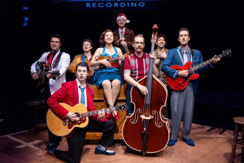 The set is charming with the small and slightly run down Sun Records studio, given some Christmas decorating by Dyanne. Lighting the small tree blows a breaker and candles must be used, inspiring a beautiful version of “Silent Night”. Props consist of nice, simple touches like vintage beer and coke bottles, with the guitars and basses front and center while Jerry Lee Lewis fires up the piano. The finale uses beautiful lighting to bring a special magic to this wonderful musical. Costumes are very well done, both era and seasonal appropriate. Upbeat numbers of “Rockin’ Around the Christmas Tree” and “Run Run Rudolph” bring the house down, as do versions of rock and country classics such as “Ring of Fire” and “Chantilly Lace”.