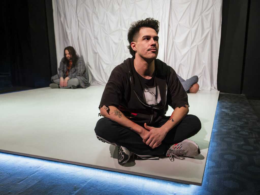 One might describe The Factory Theater’s “Kubrickian” as 2001: A Waiting for Godot Odyssey; it starts with a minimalistic stage with a white curtain backdrop, the three actors engaging in stretching/prepping – a soft beginning of physicality to come…