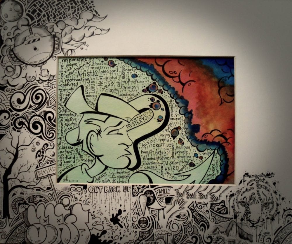 His artwork, Life of a Teen, was created with ink and watercolor and depicts phases of his teen years thus far.  “This is about my life, all the things I’ve gone through – what all teens go through – depression, anxiety, and loss.  At the same time, we have to look to the future,” says Farfan, whose future includes plans to be a pilot.