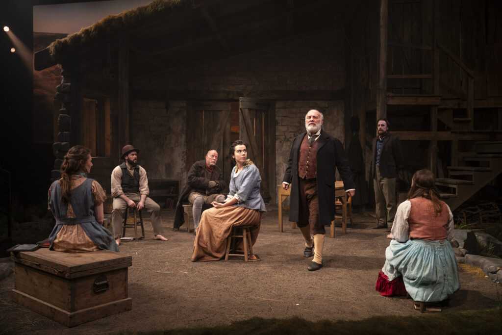 In a photo-realistic level of detail barn interior of the period (the set masterfully designed by Andrew Boyce), after an introductory scene prelude, the daily (actually evening) instruction at a hedge school is interrupted by the surprise appearance of a son of the school’s head, the native son turned gentleman, who introduces the two officers of the survey group. The ripples that emanate from this will touch everyone present, as well as the whole of the community they are in.