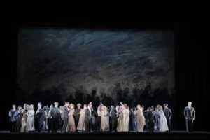 Through the mostly gloomily-set opera, the one ray of light (almost literally) falls on the soprano Sondra Radvanovsky in her beautiful portrayal of Lisa. Her light is matched in the darkness shown in the characterization of Gherman by tenor Brandon Jovanovich, as well as the great vocal and acting work by the rest of the cast, including a charming children’s chorus. The intensity of the material is occasionally offset by welcome small moments of humor, yet they in no way interrupt the inevitable flow of the downward spiral this production depicts in terrible beauty. The dramatization includes interesting elements such as the countess’ portrait displayed as the overture plays, at first showing the lady in her young beauty, then aging to her appearance in the opera.