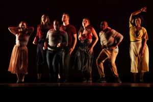 The cast of this auspicious new work is up to the challenge – all were a cohesive unit of movement and song, each well invested in their character. The music and lyrics are fresh and the story new. The male leads Nathaniel Andrew and Ryan Huemmer (portraying D.L. Winters and Connor Weir, respectively) have beautiful tenor voices and command the stage with grace. Some other standout performers included J. Xavier in his smooth depiction of the bartender
