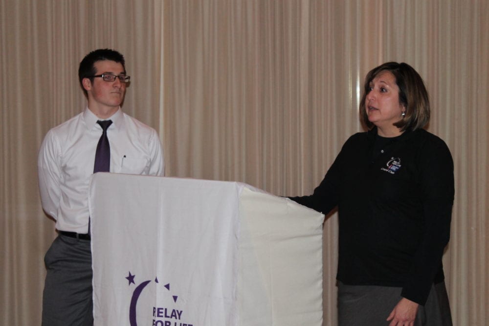 Carol Figarelli, Cancer Survivor and Team Captain of Figarelli Fighters, accompanied by her son, tells the audience of her journey through cancer.