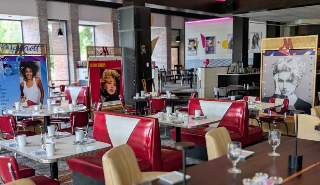 In that great pre-show eating experience, I was back in the eighties and loving every moment. Era music videos projected high on the wall in the dining area, with wait staff in neon colors, bright roller skates and period posters as decor, and a yummy Miami Vice Margarita that Crockett and Tubbs would approve of, add to the all-around atmosphere. As for the food – the Marriott name has always been synonymous with incredible cuisine. “Back to the Grill” brings it all back in delicious detail: “We Got the Bleu” (as in chicken cordon) is nicely crispy and flavorful; the “Whip It (Into Casserole)” puts seared crusted tuna over cavatappi “mac & cheese” with cremini mushrooms – decidedly decadent. Other options look just as mouthwatering; the best cultural reference has to be the lamb – “Rack On, Rack Off”. Need I say more?